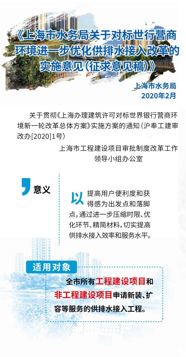 《上海市水务局关于对标世行营商环境进一步优化供排水接入改革的实施意见(征求意见稿)》 2020-08-11