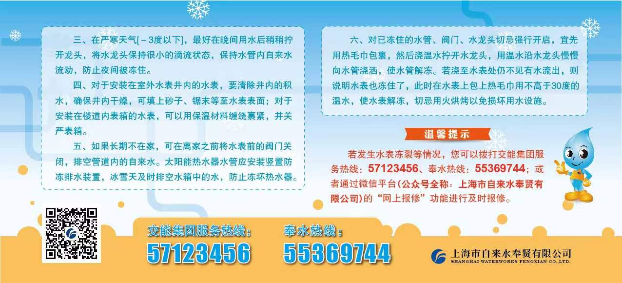 温馨提示:若发生水表冻裂等情况,您可以拨打交能集团服务热线:57123456、奉水热线:55369744;或者通过微信平台(公众号全称:江南官方网站)的“网上报修”功能进行及时报修。