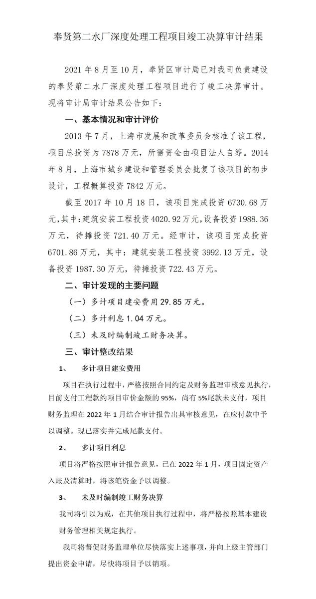 奉贤第二水厂深度处理工程项目竣工决算审计结果